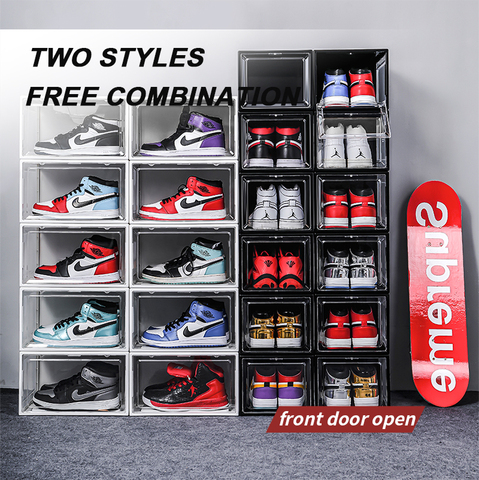 Sneaker ayakkabı rafı kutu şeffaf akrilik manyetik ayakkabı kutusu ön açık yan açık geri açık 1-3 kapı açık ayakkabı kutusu depolama toptan